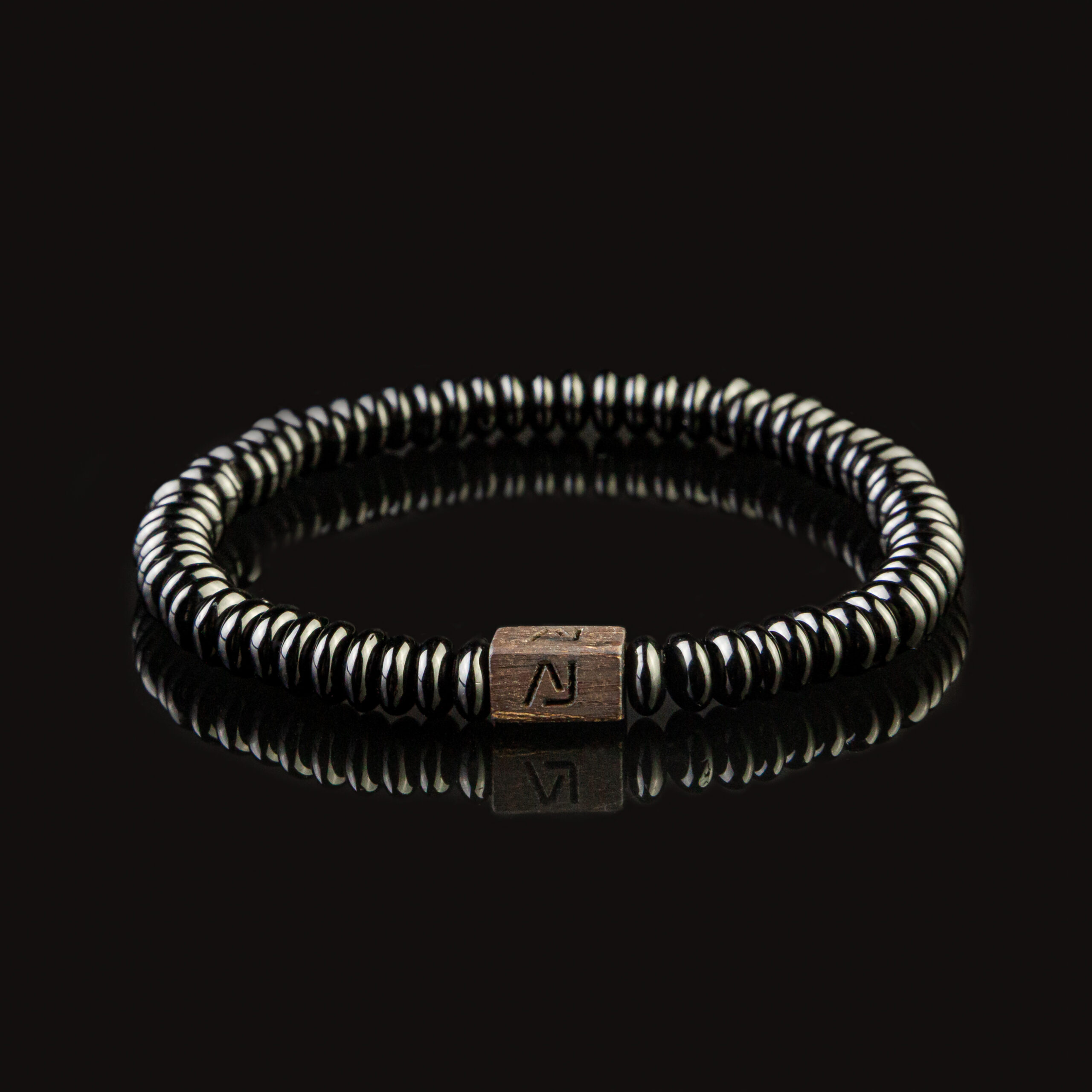 The bracelet is made from natural stones and wood.