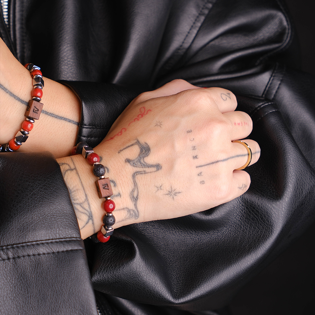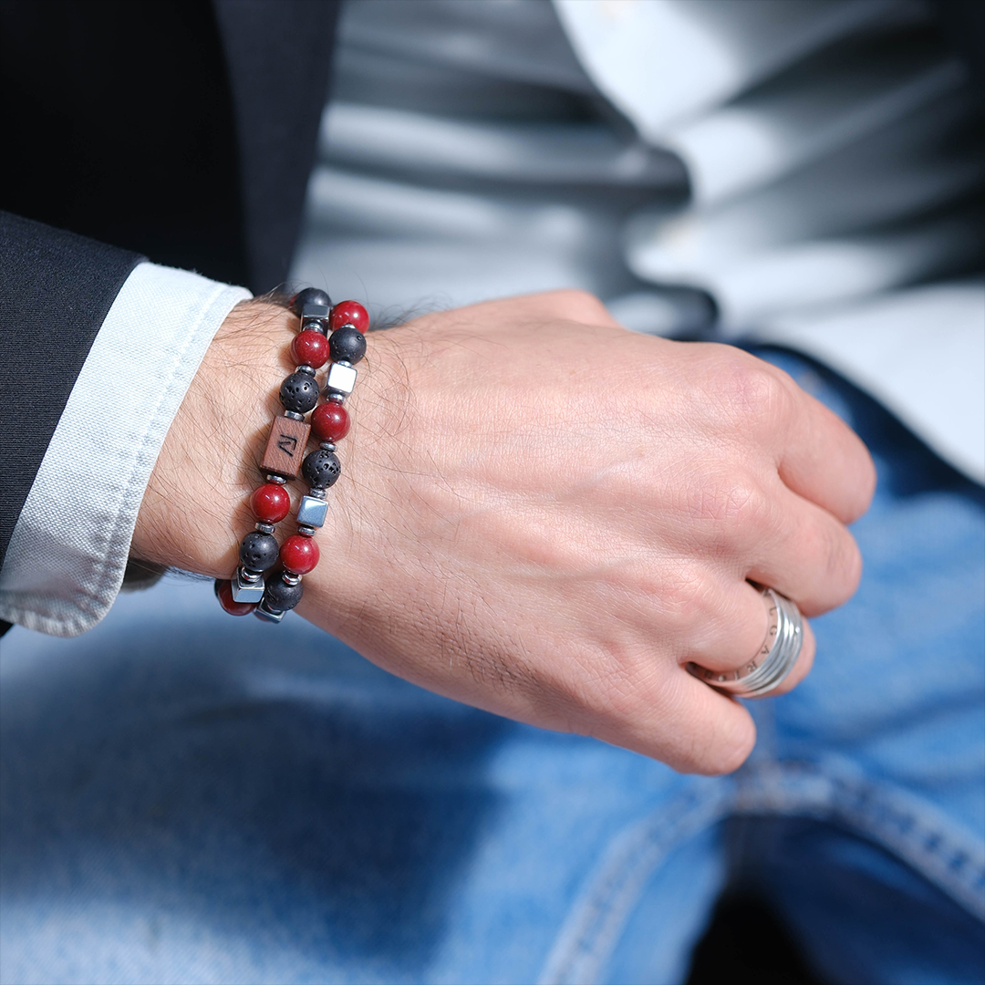 აგატის, ჰემატიტის და ლავის სამაჯური ხის ხელნაკეთი ბრენდინგით